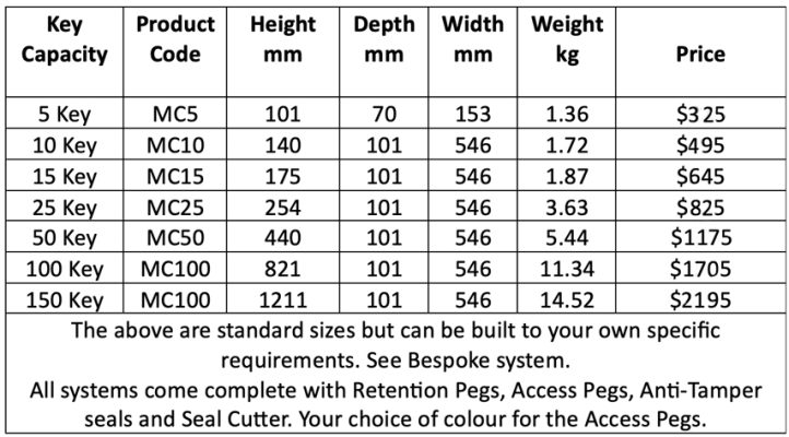 The systems range from single units, 5 capacity then multiples up to a maximum 150 keys. Each system comes complete with Retention Pegs, Access Pegs, Anti-tamper seals and seal cutter. For added security a Police approved Key Cabinet is also available to ensure your valuable assets are more secure than ever before.